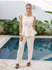 BLUSA COM MODELAGEM RETA, COM LEVES BABADOS NA BARRA. DECOTE NA COSTA QUE FORMA UM LAÇO E ELÁSTICO EMBUTIDO.
